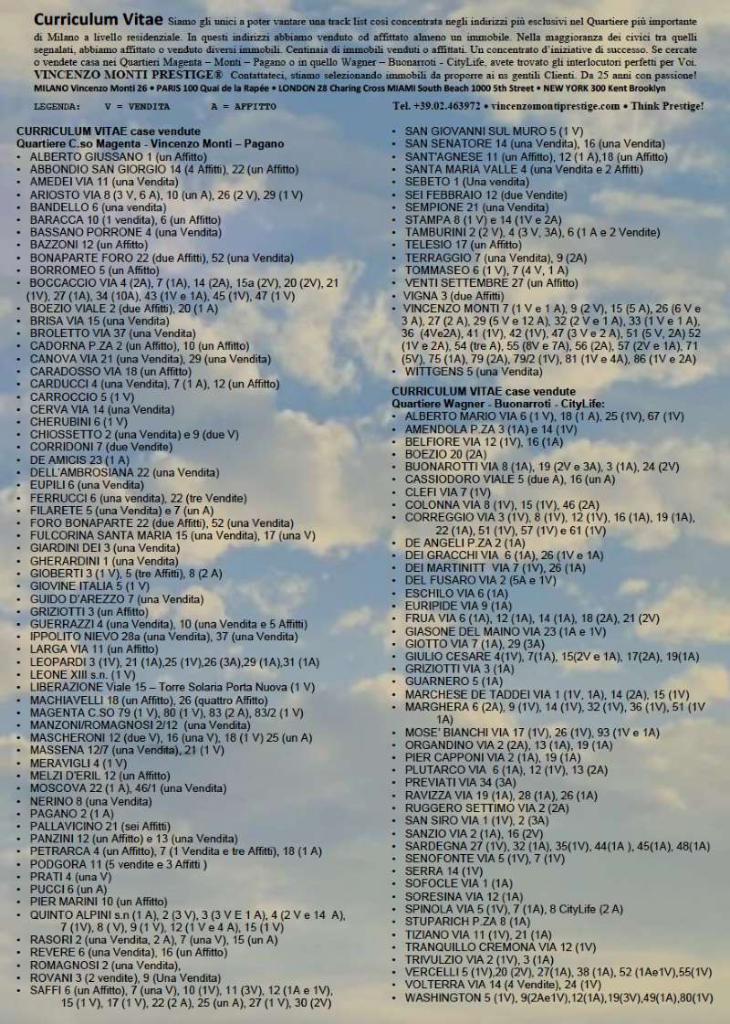 Via Rovani, Via Saffi, Via Ruffini, Via Tamburini - Vincenzo Monti Prestige® 02.43980296 Tel 347.4013254 - Specializzati da 25 anni nella Magenta, XX Settembre, Rovani, disponiamo periodicamente di prestigiosi appartamenti dai 180 ai 230 mq con terrazzi o balconi. Nella zona più esclusiva di Milano proponiamo appartamenti e attici con importanti affacci, ristrutturati o da ristrutturare in contesti di rappresentanza. Trattative riservate. Disponibile documentazioni su richiesta. Oltre a quelli pubblicati sul sito vincenzomontiprestige(.it), disponiamo periodicamente di proposte off market. Specializzati da 24 anni nel Quadrilatero, C.so Magenta, Vincenzo Monti e nei downtown di New York, Miami, Londra e Parigi, curiamo i Vostri appartamenti con la massima attenzione che meritano. Selezioniamo immobili in vendita e locazione per i nostri gentili Clienti. Vincitori premio Capital "Best 2016 - Successi Emergenti" (Classeditori). Think Prestige! VINCENZO MONTI PRESTIGE® MILANO AGENCY MONTI - Via Vincenzo Monti 26 - 20123 Milano - MM Cadorna tel. (+39).02.463972 - fax (+39).02.43400684 - monti@vincenzomontiprestige.it MILANO Vincenzo Monti 26 VENEZIA San Polo 2598 NEW YORK 300 Kent Brooklyn MIAMI South Beach 1000 5th Street LONDON 28 Charing Cross PARIS 100 Quai de la Rapée PRESS - Vincenzo Monti Prestige su principali Testate-Magazine: ILSOLE24ORE 13.01.25 MILANO FINANZA 07.09.24 CORRIERE DELLA SERA 31.08.24 CORRIERE DELLA SERA 27.06.24 MILANO FINANZA 10.02.24 ILSOLE24ORE 15.01.24 CORRIERE DELLA SERA 13.01.24 MILANO FINANZA 23.09.23 ILSOLE24ORE 12.09.23 GENTLEMAN RE 04.03.23 ILSOLE24ORE 23.01.23 CORRIERE DELLA SERA 23.01.23 BLOOMBERG 21.01.23 ILSOLE24ORE.COM 13.01.23 MAGIC LAKE COMO Winter 2022 MILANO FINANZA 10.09.22 CORRIERE DELLA SERA 05.09.22 IDEALISTA.IT 08.09.22 REQUADRO.IT 07.09.22 IDEALISTA.IT 01.02.22 REQUADRO.IT 24.01.22 CORRIERE DELLA SERA 16.01.22 MILANO FINANZA 15.01.22 AD ARCHITECTURAL DIGEST Settembre 2021 MAGIC LAKE COMO Autumn 2021