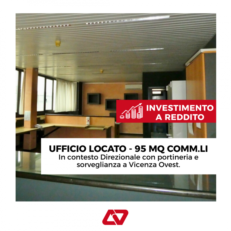 INVESTIMENTO A REDDITO: UFFICIO OPEN-SPACE DI 95 MQ COMM.LI OTTIMAMENTE LOCATO, IN VENDITA A VICENZA VERSANTE OVEST - Rif. 7849 L'immobile è ubicato al piano primo di elegante Palazzina Direzionale con servizio di portineria e vigilanza, oltre ad ampia disponibilità di parcheggio nelle immediate vicinanze dell'edificio. Ha una superficie di circa 86 mq utili (95 mq commerciali) completamente open-space, più servizio igienico finestrato con antibagno. Impianto di riscaldamento e raffrescamento autonomi. Si tratta di un ambiente con spazi luminosi grazie alle ampie finestre, un contesto curato e sicuro, e una posizione strategica, perfettamente collegata al centro città, alla zona Fiera, alla tangenziale e al casello autostradale. OTTIMO INVESTIMENTO: contattateci per i dettagli!! Per info chiamare Valeria Rispo: cell. 393/9776565. AGENZIA VICENZA SEDE di Andrea Marchetti via Legione Antonini, 146 Vicenza 0444/963900 www.agenziavicenza.it - marchetti@agenziavicenza.it Aderente alla Borsa Immobiliare della C.C.I.A.A. di Vicenza --- annuncio pubblicato con GESTIONALEIMMOBILIARE.it