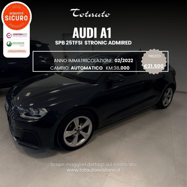 Audi A1 Sportback 25 TFSI S-tronic Admired immatricolazione 02/2022 con 38000 Km. ACCESSORI:Equipaggiamenti presenti sulla vettura: Audi pre sense front Avviso di corsia Audi smartphone interface Bracciolo anteriore Clima automatico bizona Cerchi in lega 17'' a 5 razze a Y grigio grafite Ruota di scorta minispare Limitatore di velocità Modanature nere Parabrezza atermico Pacchetto vano bagagli Digital cockpit Sensori luci e pioggia automatici Sensori di parcheggio posteriori Specchietto interno antiabbagliamento Specchietti regolabili riscaldabili e ripiegabili Inserti decorativi poligonali neri Interni in look alluminio Superfici decorative in nero lucido Volante in pelle 3 razze multifunzione plus .(Salvo errori di trascrizione) Tutte le nostre vetture sono sottoposte a tagliando completo, collaudo e prova su strada prima della consegna, hanno 12 mesi di garanzia sono finanziabili anche interamente senza anticipo. Inoltre è possibile avere la FATTURA CON IVA ESPOSTA PERTANTO E' ANCHE APPLICABILE LEGGE 104 PER DISABILI, con l'agevolazione dell'iva al 4% e la riduzione del passaggio di proprietà se previsto. il prezzo s'intende messa su strada esclusa. Solo da TOTAUTO ?L'usato che vuoi tu !!? Via Cap. B.Licheri, 2 angolo Corso Umberto I GHILARZA Tel 0785-54116 Cell.333-5335451 Altre informazioni sul nostro sito web totautooristano oppure sulla nostra Pagina Facebook.