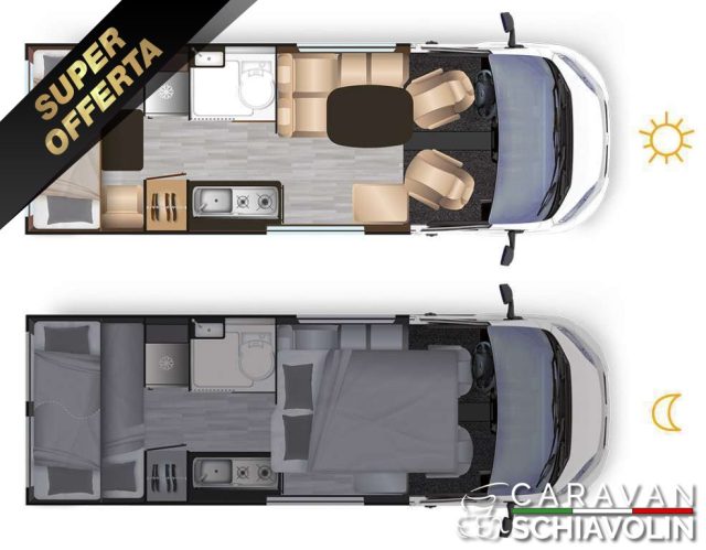 ORA IN OFFERTA! PREZZO TOTALE DEL VEICOLO CON GLI ACCESSORI EXTRA INDICATI SCONTATO A SOLI ? 63.500,00 ANZICHE' ? 71.520,00. n.b. Prezzo in offerta si intende senza permuta, Si valutano eventuali permute.FINITURA ADDICT ? 7.100,00 ( Elementi della finitura FUN PLUS (Vernice paraurti anteriore colore carrozzeria + Skid plate nero + Comandi radio al volante + Porta zanzariera scorrevole laterale + Oscuranti parabrezza e finestre cabina isotermici a doppio plissé a rullo + Gradino elettrico + Autoradio PIONEER® USB con funzione BLUETOOTH® + Ambiente TEP*: ARIZONA o Tessuto/TEP* PEPPER + Riscaldamento a carburante WEBASTO 4000 W + 2a batteria cellula a elettrolita liquido + 2a chiave telecomandata (PLIP) + Grondaia porta laterale con illuminazione a LED integrata + Decorazione esterna FUN+ e cerchietti + bagno DUO'SPACE con parete girevole + Fari fendinebbia anteriori) + Batteria cellula AGM 92 Ah + 2a batteria cellula AGM 92 Ah (con accoppiatore, separatore e booster) + Stazione multimediale DAB KENWOOD® con schermo 6,8" e funzioni APPLE CAR PLAY/ANDROID AUTO + Telecamera di retromarcia con monitor di controllo integrato al cruscotto + Doccetta esterna con acqua fredda + Sedili ISOFIX + Decorazione esterna ADDICT + Quadro di controllo digitale + PACK SMART( Cerchi 16" in lega leggera bicolore + Volante e pomello del cambio in pelle + Rivestimento griglio su aeratori))Serbatoio acque grigie riscaldato ? 320,00PUNTI DI FORZA = Modello famigliare + Ambientazione unica con cameretta per bambini + Salotto bambini posteriore + 5 posti omologati (Libretto di circolazione) + 5 posti letto (letti a castello posteriori, trasformazione in posto letto della dinette posteriore e letto basculante a scomparsa assistita da martinetti) + Frigorifero a compressione 149 L VAN PER LA FAMIGLIA CON 5 POSTI OMOLOGATI IN VIAGGIO, FRIGORIFERO GRANDE, CAMERA PER BAMBINI POSTERIORE, 5 POSTI LETTO IN SOLI 6.36 MTIN PRONTA CONSEGNAIN OFFERTA