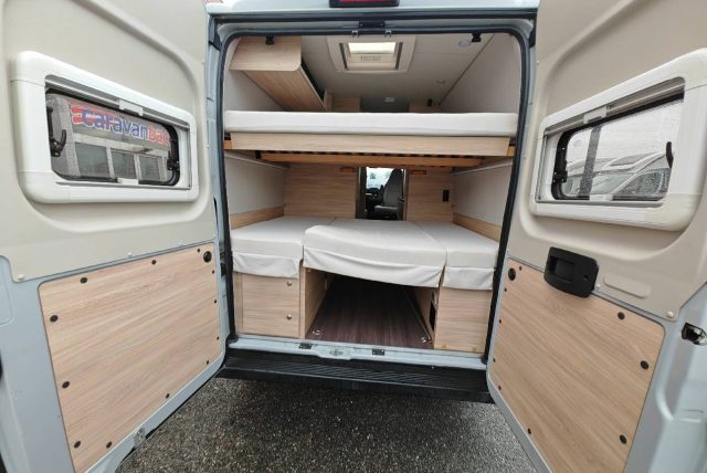 Furgonato con letti matrimoniali a castello posteriori e sottostante gavone di carico, bagno con doccia e frigo a compressore con blocco cucina nella parte centrale, semidinette con sedili girevoli nella zona anteriore. Fascia di prezzo ? 52.500 - ? 57.500