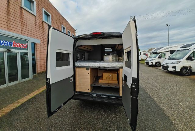 Furgonato con semidinette completata dai sedili girevoli in cabina nella zona anteriore, cucina con frigo a compressore da 84 l e bagno con doccia nella zona centrale, letti singoli gemelli nella zona posteriore con sottostante vano di carico.