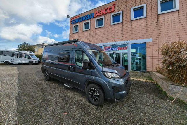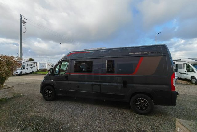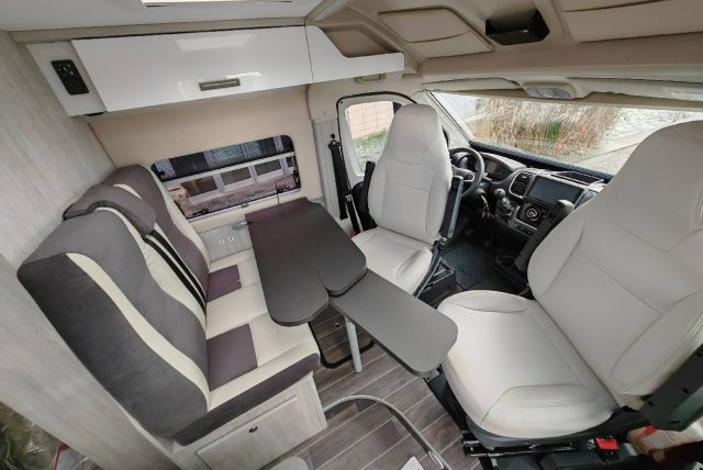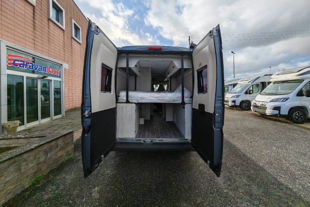 Van con letto matrimoniale posteriore basculante elettrico, bagno con doccia e cucina con frigo a compressore da 70l nella zona centrale, semidinette con sedili anteriori girevoli.