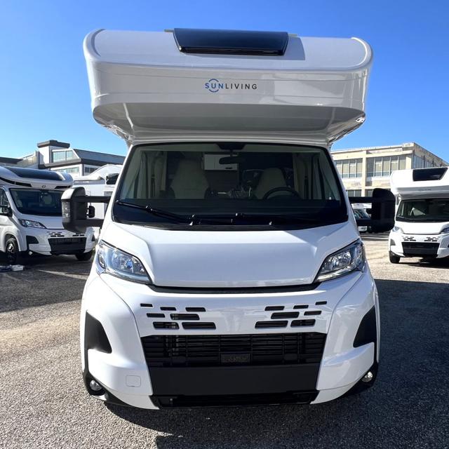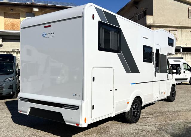 Marchio: Sunliving, Modello: A75 DP, Veicolo: Nuovo, Motore: Fiat Ducato 2.2 140 CV, Colore esterno: Bianco, Lunghezza: 7,42 m, Larghezza: 2,29 m, Altezza: 2,94 m, Posti omologati: 5, Posti letto: 6, Riscaldamento: Truma Combi Diesel. Oltre ? 6.000 di optional già inclusi nel prezzo: Frenata automatica di emergenza, Paraurti verniciato in tinta, Piastra paramotore nera, Radio DAB con comandi al volante + antenna, Cerchi in lega da 16?, Diffusori aria cromati su cruscotto, Serbatoio recupero calore motore riscaldato, Valvola elettrica scarico acque grigie, Riscaldamento TRUMA COMBI DIESEL con boiler, Climatizzatore in cabina guida, Filtro gas TRUMA, Cornice finestra cucina, Tavolo dinette regolabile, Oblò panoramico + 2 finestre laterali in mansarda, Porta ingresso con finestra, zanzariera e chiusura centralizzata, Pianale mansarda sollevabile, Sedili cabina girevoli, Oblò HEKI 70×50 zona living, Sensori di retromarcia, Finestre a cornice integrate, Luci posteriori Full LED, Pavimento tetto in vetroresina, Prese USB, Frigorifero a compressore da 157 litri, Predisposizione impianto solare, Predisposizione TV, Predisposizione climatizzatore, Convertitore DC/DC, Doppio portellone garage. + Pacchetto CamperLike (a soli ? 1.990 anziché ? 3.000): Tendalino, Radio 2 DIN, Retrocamera, Pannello solare. + Trasporto e immatricolazione (a soli ? 1.900 anziché ? 2.500), Prezzo camper configurato: ? 73.790 (anziché ? 81.400).