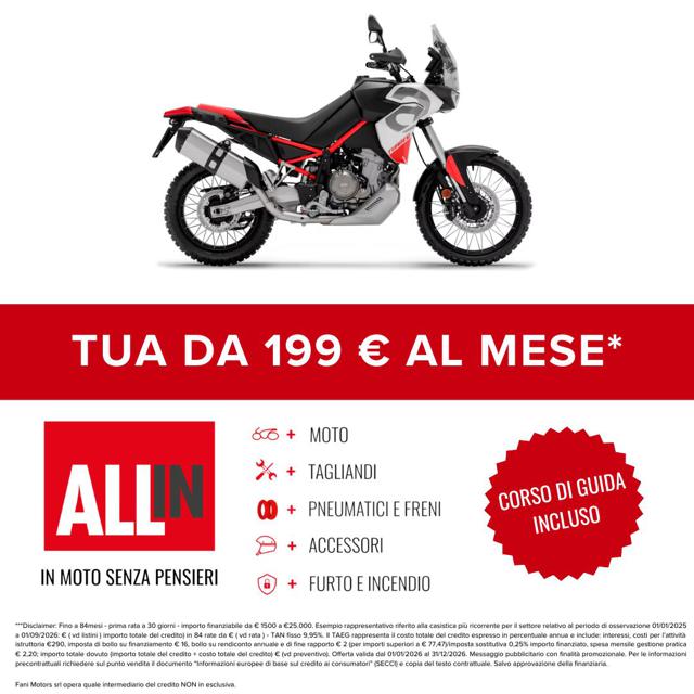 Moto disponibile in pronta consegna ( salvo esaurimento scorte ) in tutte le colorazioni disponibili a listino - vedi sito costruttore. Finanziamenti su misura per rendere l?acquisto ancora più semplice. Consegna in tutta Italia, isole comprese. Eventuali accessori non inclusi nel prezzo indicato. Valutiamo la tua permuta! Inviaci foto targa e descrizione della tua moto usata per ricevere il miglior preventivo personalizzato. Fani Motors è Firenze dal 1975 nelle sue 4 sedi con oltre 20 marchi Contatta un nostro consulente saremo felici di risponde alle tue domande! Disclaimer: L'annuncio può indicare il prezzo di partenza tra le colorazioni del listino, salvo promo e/o altro incentivo in corso, esclusa immatricolazione e messa su strada. Le rate mensili potrebbero variare in base alle richieste del singolo cliente. Formula ALL-IN = Anticipo + 12/24/36/48 rate + riscatto ( Può includere - Accessori/Furto/Incendio/Tagliandi/Gomme/Freni/Estensione garanzia ) Eventuali accessori o altro sono da considerarsi inclusi/esclusi come da indicazione listino costruttore