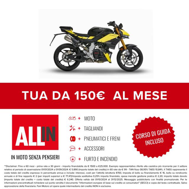 Moto disponibile in pronta consegna Finanziamento totale disponibile per rendere l?acquisto ancora più semplice. Consegna in tutta Italia, isole comprese. Eventuali accessori non inclusi nel prezzo indicato. Valutiamo la tua permuta! Inviaci foto e descrizione della tua moto usata per ricevere il miglior preventivo personalizzato. 50 anni di storia: Fani Motors, concessionaria ufficiale di 25 brand, dal 1975 al servizio della passione per le due ruote.