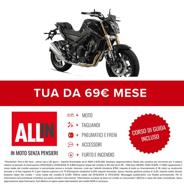 Moto disponibile in pronta consegna ( salvo esaurimento scorte ) Finanziamenti su misura per rendere l?acquisto ancora più semplice. Consegna in tutta Italia, isole comprese. Eventuali accessori non inclusi nel prezzo indicato. Valutiamo la tua permuta! Inviaci foto e descrizione della tua moto usata per ricevere il miglior preventivo personalizzato. Fani Motors è Firenze dal 1975 nelle sue 4 sedi con oltre 20 marchi Contatta un nostro consulente, saremo felici di risponde alle tue domande! Disclaimer: L'annuncio può indicare il prezzo di partenza tra le colorazioni del listino, salvo promo e/o altro incentivo in corso, esclusa immatricolazione e messa su strada. Le rate mensili potrebbero variare in base alle richieste del singolo cliente. Formula ALL-IN = Anticipo + 12/24/36/48 rate + riscatto ( Può includere - Accessori/Furto/Incendio/Tagliandi/Gomme/Freni/Estensione garanzia )