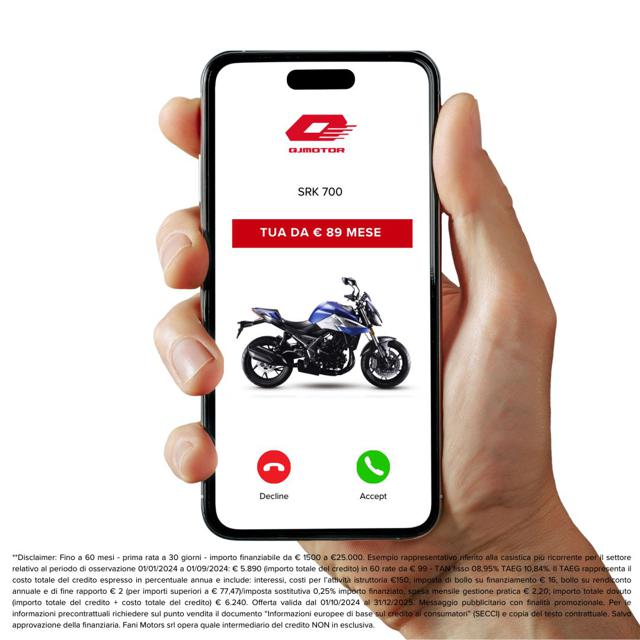 Moto Nuova ( possibilità di permuta usato come anticipo ) disponibile in tulle le colorazioni - vedi listino costruttore Esempio informativo ( salvo approvazione finanziaria ) Anticipo ? 1000 + 89x36 + 2698 ? riscatto Consegniamo in tutta Italia isole comprese! Per maggiori info contatta un nostro consulente! Disclaimer: L'annuncio indica il listino di partenza tra le colorazioni disponibili, salvo promo e/o altro incentivo in corso ( f.c.) Le rate mensili potrebbero variare in base alle richieste del singolo cliente. Formula ALL-IN = Anticipo + 12/24/36/48 rate + riscatto ( Può includere - Accessori/Furto/Incendio/Tagliandi/Gomme/Freni/Estensione garanzia ) Eventuali accessori o altro sono da considerarsi inclusi/esclusi come da indicazione listino costruttore.