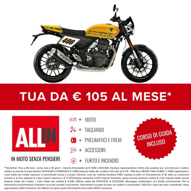 Moto disponibile in pronta consegna ( salvo esaurimento scorte ) in tutte le colorazioni disponibili a listino - vedi sito costruttore. Finanziamenti su misura per rendere l?acquisto ancora più semplice. Consegna in tutta Italia, isole comprese. Eventuali accessori non inclusi nel prezzo indicato. Valutiamo la tua permuta! Inviaci foto e descrizione della tua moto usata per ricevere il miglior preventivo personalizzato. Fani Motors è Firenze dal 1975 nelle sue 4 sedi con oltre 20 marchi Contatta un nostro consulente saremo felici di risponde alle tue domande! Disclaimer: L'annuncio può indicare il prezzo di partenza tra le colorazioni del listino, salvo promo e/o altro incentivo in corso, esclusa immatricolazione e messa su strada. Le rate mensili potrebbero variare in base alle richieste del singolo cliente. Formula ALL-IN = Anticipo + 12/24/36/48 rate + riscatto ( Può includere - Accessori/Furto/Incendio/Tagliandi/Gomme/Freni/Estensione garanzia ) Eventuali accessori o altro sono da considerarsi inclusi/esclusi come da indicazione listino costruttore