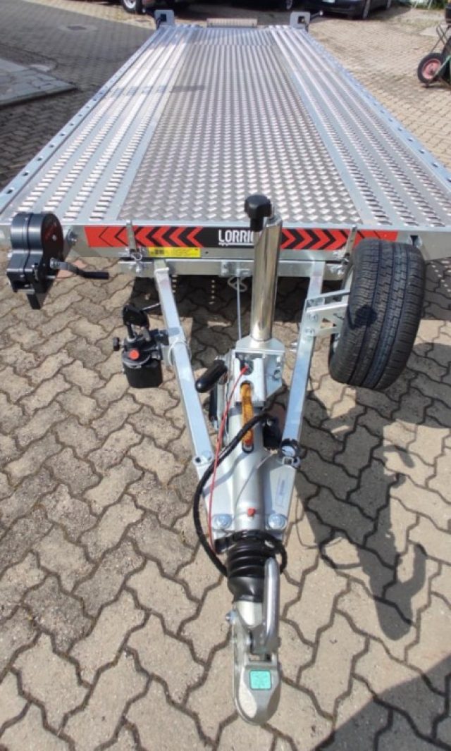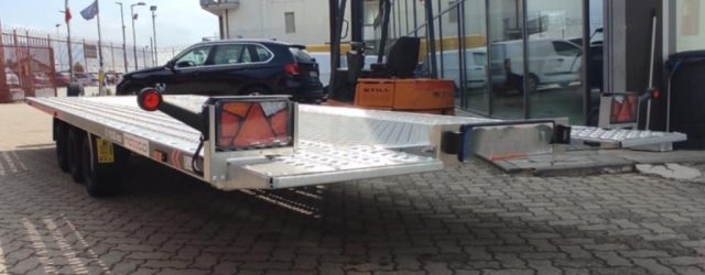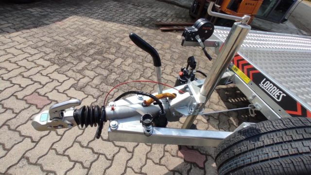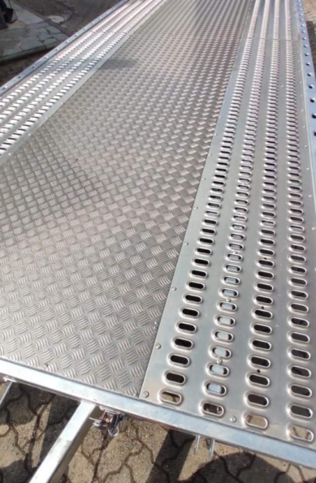 Larghezza esterna con bordo 216 cm, 3 assi frenati ALKO o KNOTT, Ruote R10, Costruzione zincata a caldo, Argano a mano, Sistema di inclinazione delle luci posteriori, Due attuatori per l'inclinazione del telaio di accesso, Ruota di supporto stabile, Piattaforma di carico inclinabile idraulicamente tramite attuatore meccanico con pompa manuale monolaterale, Riempimento in lamiera di alluminio all'interno, lampade a LED, Ruota di scorta con supporto.